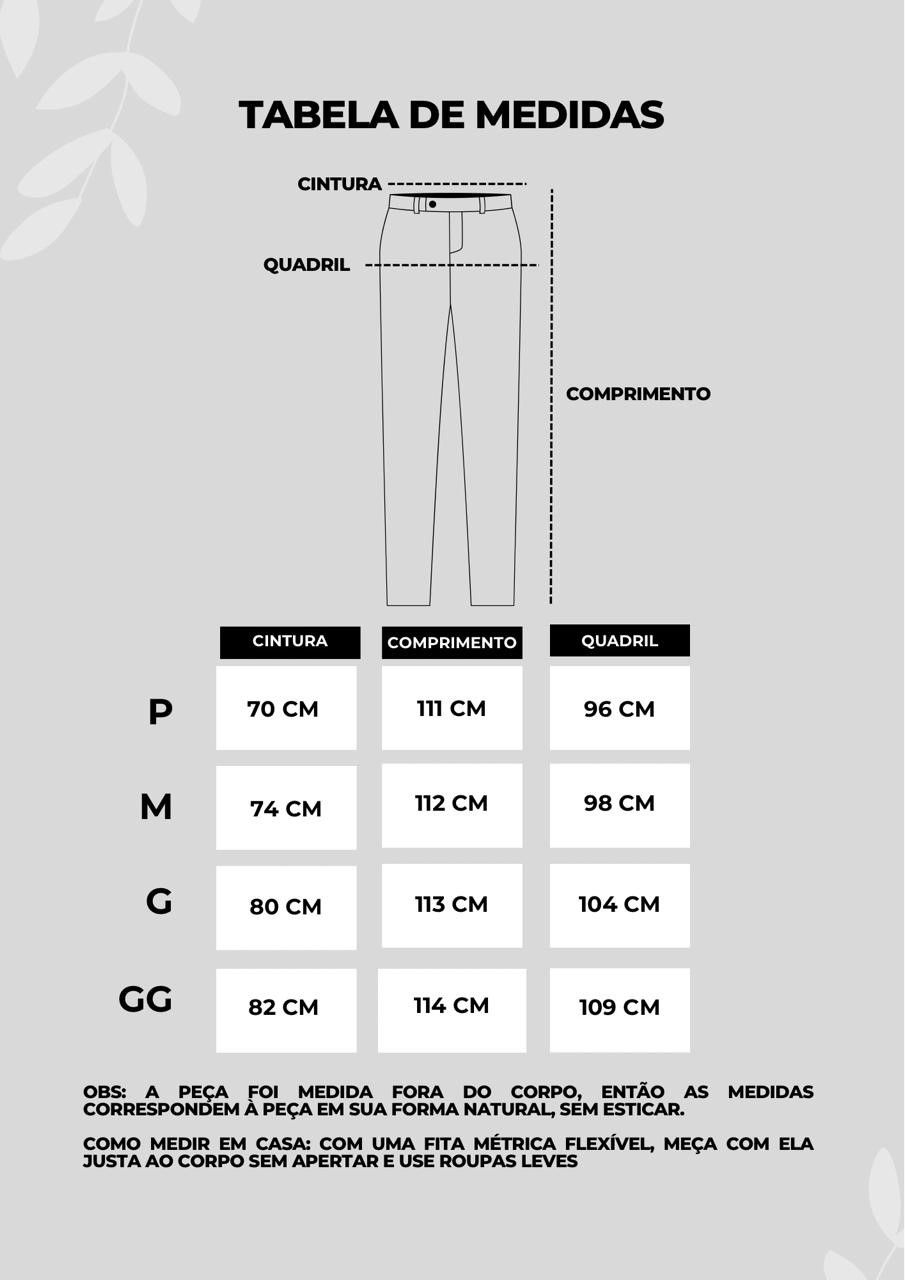 Para preservar a qualidade da calça, recomenda-se lavar à mão ou na máquina no modo delicado, sempre com água fria e sabão neutro, evitando alvejantes e produtos abrasivos. Não torcer a peça para não comprometer o recorte e as pinças. A secagem deve ser feita à sombra, em local arejado, evitando secadora. Para guardar, prefira pendurá-la em cabide adequado ou dobrá-la com cuidado, mantendo-a em ambiente seco e protegido da luz direta, garantindo a conservação do caimento e do acabamento.