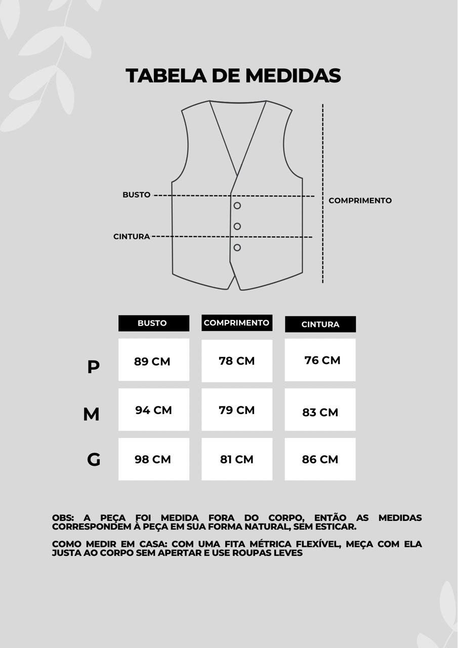 Para conservar o colete de alfaiataria e manter seu caimento impecável, recomenda-se lavar à mão ou na máquina no modo delicado, utilizando água fria e sabão neutro, sempre sem alvejantes. Evite torcer a peça para não deformar a modelagem acinturada. A secagem deve ser feita à sombra, em local arejado, preferencialmente em cabide para preservar o formato. Para guardar, mantenha o colete pendurado em cabide adequado, em ambiente seco e protegido da luz direta, garantindo maior durabilidade e elegância da peça.